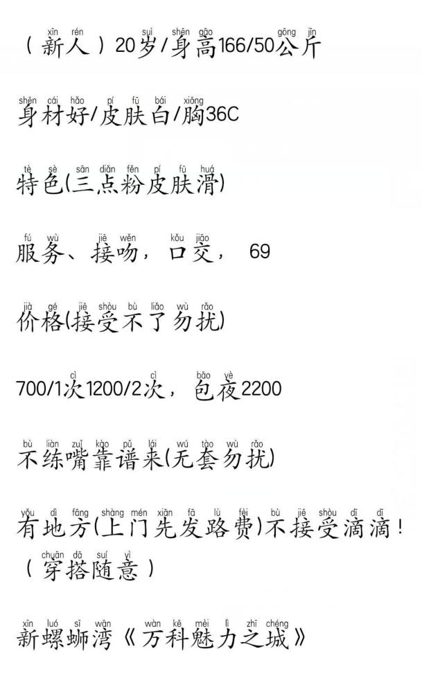 【寻欢细节】:自己开发的,前几天有空去试了下。mm需要提前在qq上预约时间,预约后驱车前往。妹妹是自租的公寓安全方面没什么问题。见面后第一感觉挺漂亮很萝莉还有jk服。服务前可以鸳鸯浴,洗澡时帮口很舒服,清洗干净后上床服务,漫游69小穴没啥异味,最后换上黑丝抽查结束。总的来说还可以,颜控的可以去试试。 【附带照片】: