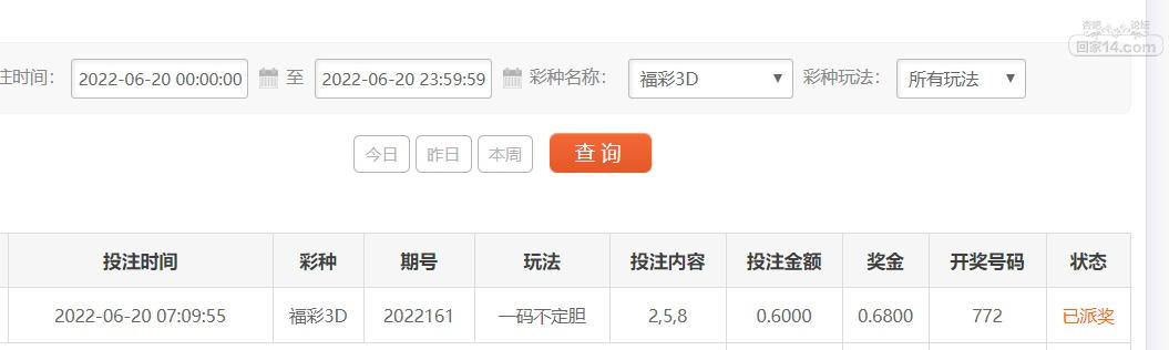 福彩3D中了一个数
