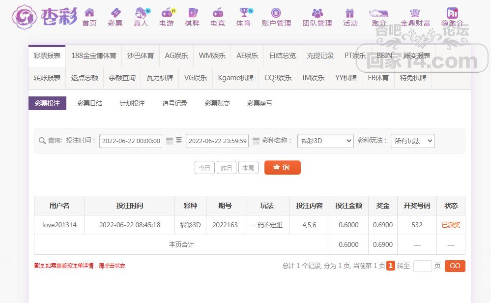 福彩3D中了一个呢!