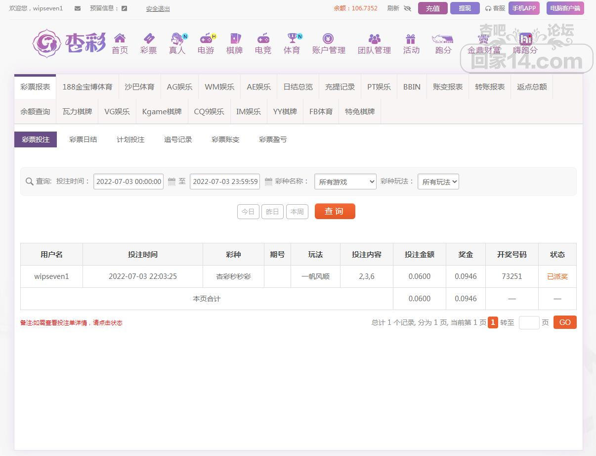 杏彩下注快频彩赢单