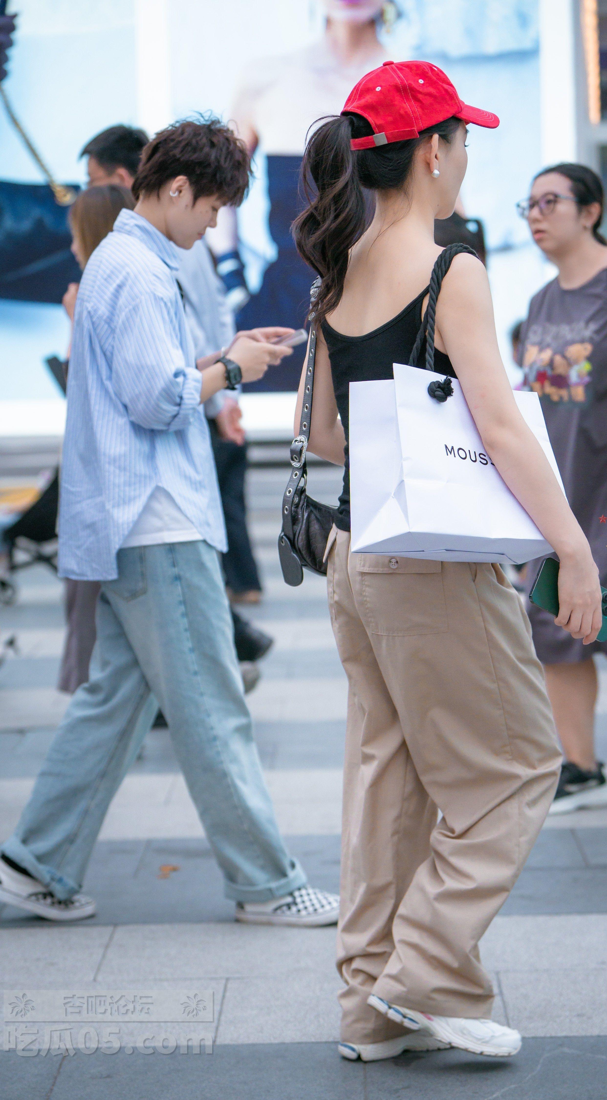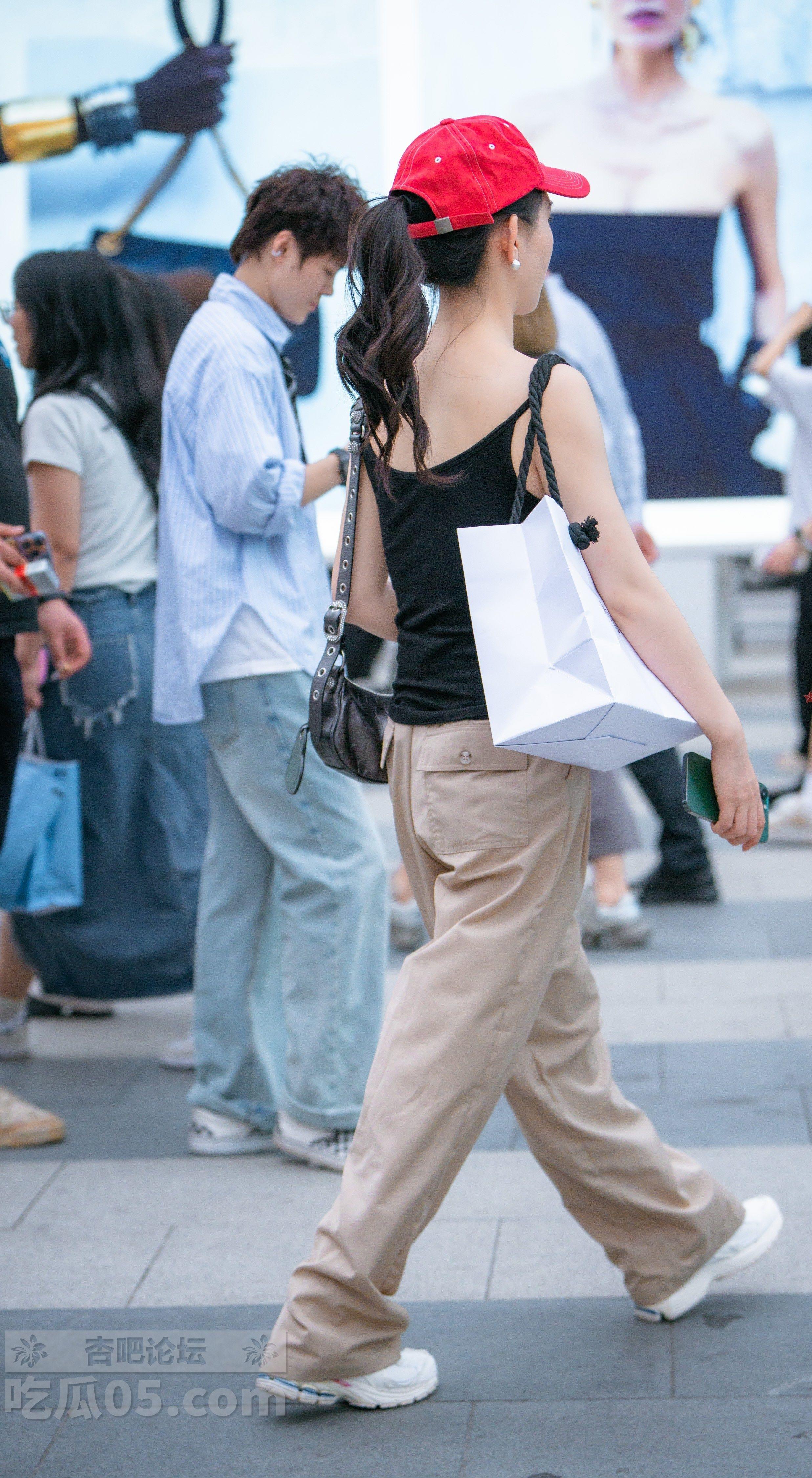 黑色背心浅色长裤红色帽子美女走路过人行道【10P】